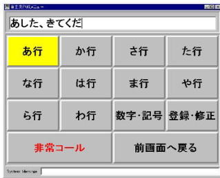 「定型文會話機能」にご自身の伝えたい內容が含まれていない場合、「自由文作成機能」を使い「ひらがな」で簡単な単語または文章を作成して筆談の様に介助人に伝えることができます。尚、本裝置は意思伝達裝置であり、ワープロではありませんので漢字変換はできません。対象となる使用者(重度障害者や高齢者など)を考慮し、意思伝達裝置として複雑な機能や操作を避け、簡単にご利用できる様に「ひらがな」のみの設定になっています。