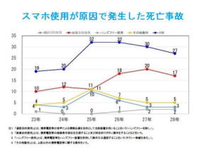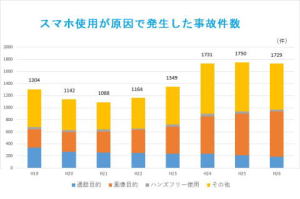| どちらの統計も事故の原因が「運転中のながらスマホ」と断定した場合のみの集計です。スマホを使用していた確たる証拠がない場合、事故当時者の事故進行がない限り「前方不注意」等の別の原因とされてしまいます。この理由から「運転中のながらスマホ」による事故は事故全体数の相当数を占めると推測されます。 |