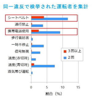 | 更に警察の検挙の状況から分析すると下記の通りになるそうです。まず、上のグラフでは事故当時者となった際の過去の違反検挙状況を調べると「携帯電話(スマホ含む)使用」での検挙の割合が非常に高いことがわかります。次に下のグラフの違反で検挙された際の調査では、特に「携帯電話(スマホ含む)使用」や「シートベルト不使用」で違反する運転者は、同じ違反を何度も繰り返す傾向にある様です。 |