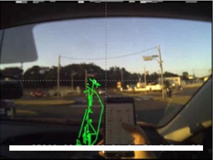 | 前述の問題点であった「一定速度で移動しているスマホ使用者が運転者か同乗者(公共交通機関の利用者)かを判別」することができれば、使用中のスマホを強制的に機能停止できることから重大事故を確実に防止できることは間違いありません。実はこの運転者の判別はスマホ使用者の注視点(視線)を検出することで簡単に実現できます。 次の3枚の写真は、「一般社団法人 日本自動車連盟(JAF)」が行った実験結果です。弊社においても、「TE-9200 注視点測定システム」を利用してほぼ同時期に同様の実験を行いましたが、同じ結果が得られています。 |